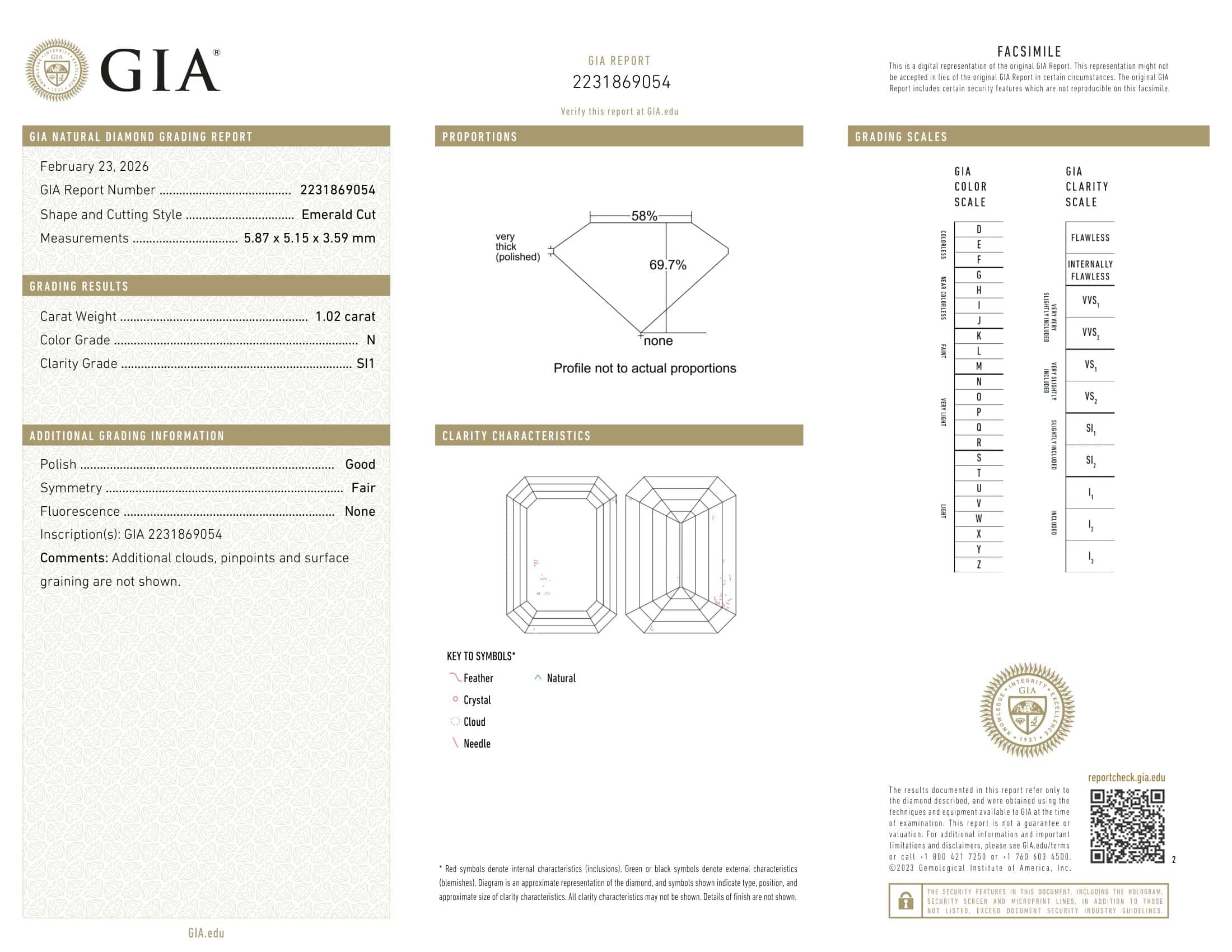 GIA Report Number 2231869054 confirms the diamond’s key grading details, including 1.02 carat weight, N color grade, and SI1 clarity grade. The report also notes Good polish, Fair symmetry, and no fluorescence. Laser inscription reads “GIA 2231869054” for easy matching to the certificate.